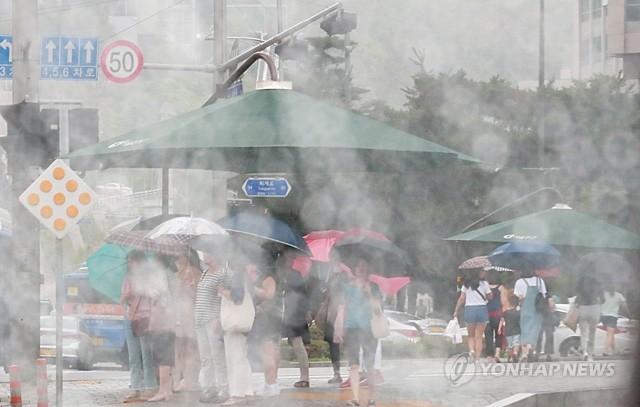 장맛비가 내린 25일 오후 서울 중구 충무로1가 신세계백화점 앞에서 시민들이 우산을 쓴 채 횡단보도를 건너고 있다.
