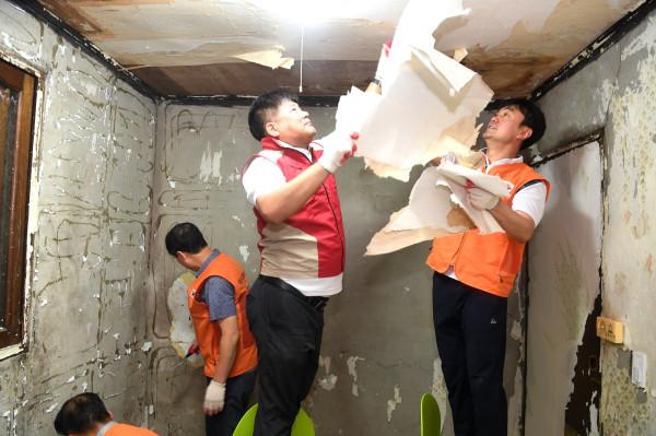 경기 하남시가 26일 롯데건설과 저소득 취약계층의 주거환경 개선을 위한 두 번째 '(집)수리 하남?!' 사업을 실시했다. 이날 집수리는 신장동 한 가정의 벽지, 장판 등을 교체했다. 사진은 김상호 시장(오른쪽)과 관계자들이 벽지를 교체하는 모습. (사진제공=하남시청)