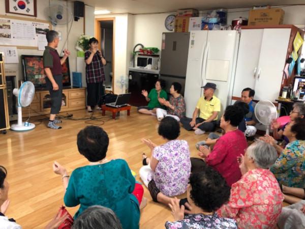 서울 금천구 시흥1동 주민센터가 최근 무더위 연장쉼터로 운영되고 있는 구립 새재미경로당에서 지역 노인 26명을 초대해 ‘주말 실버노래교실’을 운영했다. 사진은 참여자들이 노래를 부르고 있는 모습. (사진제공=금천구청)