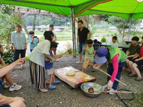서울 구로구가 여름방학을 맞아 최근 경기 양평군 여물리체험마을에서 ‘자녀와 함께하는 환경체험교육’을 실시했다. 이날 체험교육에서는 수박 빙수 만들기, 인절미 떡메치기 등의 체험활동이 진행됐다. 사진은 떡메치기 체험을 하고 있는 어린이들모습. (사진제공=구로구청)