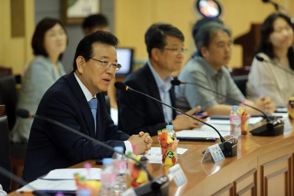 서울 강남구는 29일 구청 3층 큰회의실에서 민·관·학 협치를 통해 복지기준선을 마련하기 위해 ‘강남복지거버넌스 출범식’을 개최했다. 사진은 출범식에 참석한 정순균 구청장(왼쪽)이 복지거버넌스 위원들에게 인사말을 전하고 있는 모습. (사진제공=강남구청)