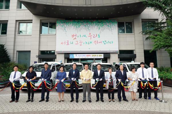 서울 동대문구는 29일 구청 광장에서 택시 지원이 필요한 대상에 이용권을 제공하는 ‘저소득 장애인 돌봄 택시 지원 사업 발대식 및 업무 협약식’을 개최했다. 사진은 유덕열 구청장(왼쪽에서 여섯 번째)과 관계자들이 테이프 커팅을 하는 모습. (사진제공=동대문구청)