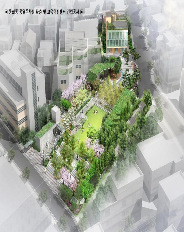 동화동 공영주차장 조성사업은 기존 지상 2층 공영주차장을 철거 후 지하에 다시 짓는 것으로 지하에는 차량 249대를 수용할 수 있는 주차장이, 지상에는 교육혁신센터와 녹지공간이 각각 조성될 예정이다.