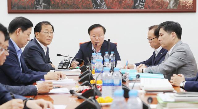 자유한국당 소속 김재원 예산결산특별위원장(가운데)이 30일 오후 국회에서 여야 3당 간사들과 구윤철 기획재정부 2차관 등과 함께 예산안 조정소위를 열고 인사말하고 있다. /연합뉴스