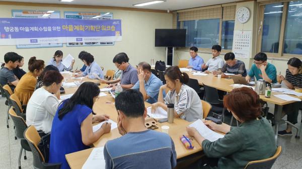 경기 수원시 팔달구 행궁동은 지난 29일 주민자치회실에서 행궁동 마을계획 기획단 워크숍을 개최했다. 사진은 참여자들이 행궁동의 교통·교육·축제·안전 분야에 대한 이야기를 나누고 있는 모습. (사진제공=수원시청)