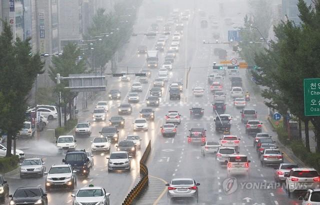 서울 등 수도권 곳곳에 호우 특보가 내려진 31일 오전 경기도 수원시 1번 국도에서 차량이 전조등을 켠 채 서행하고 있다.