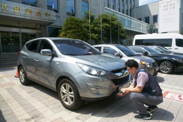 | ▲ 5일 구청 주차장내 진입한 체납차량을 시스템으로 확인하고 단속직원이 영치업무를 수행하고 있다. (사진제공=서초구청) | ||