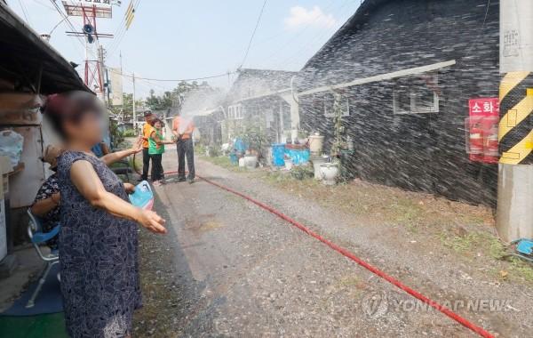 폭염경보가 발효된 5일 송파구 화훼마을에서 구청 관계자와 소방대원들이 지열을 낮추기 위해 물을 뿌리고 있다.