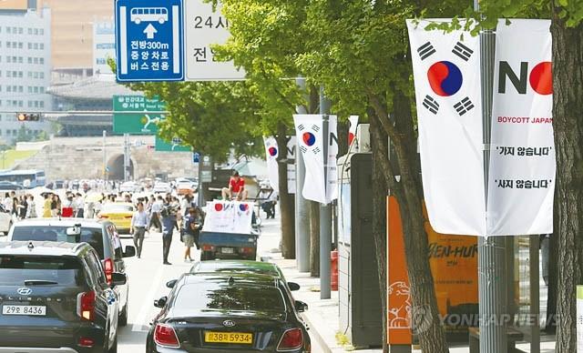 6일 오전 서울 중구 시청 인근에서 중구청 관계자가 일본이 백색국가(화이트리스트)에서 한국을 제외한 것에 대한 항의의 뜻으로 ‘노(보이콧) 재팬 : 가지 않습니다 사지 않습니다’라고 적힌 배너기를 설치하고 있다.