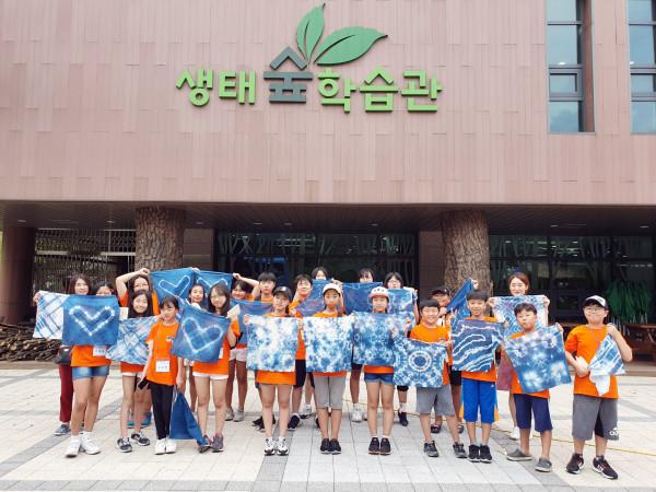 최근 서울 구로구가 자매도시인 괴산군에서 어린이 농촌체험을 진행했다. 이번 체험에서 아이들은 천연비누 만들기, 천연염색하기 등 다양한 프로그램을 체험했다. 사진은 천연염색한 손수건을 들고 기념촬영을 하고 있는 아이들의 모습. (사진제공=구로구청)