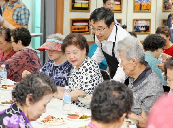 서울 도봉구는 6일 방학동 노인복지센터에서 ‘복맞이 사랑의 삼계탕 나눔행사’를 개최했다. 이날 지역내 노인 200여명에게 삼계탕을 대접했다. 사진은 행사에 참석한 이동진 구청장이 노인들에게 삼계탕을 전달하고 안부를 묻는 모습. (사진제공=도봉구청)