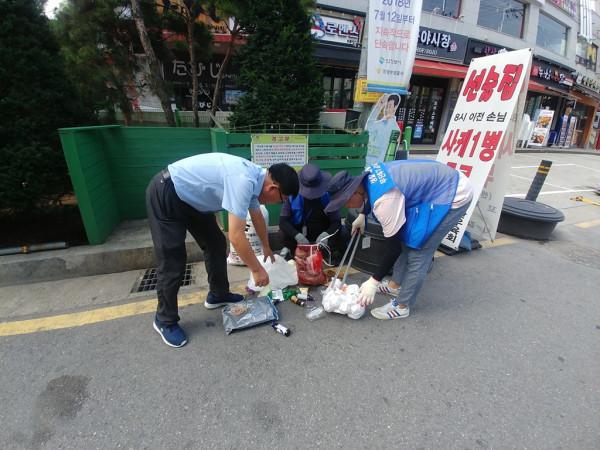 경기 의정부시 호원2동 허가안전과는 지난 5일 자원순환과에서 지원을 받은 무단투기 감시원들과 함께 유동인구가 많은 회룡역을 중심으로 방치되거나 종량제 봉투 미사용 생활쓰레기의 파봉작업을 실시했다. 파봉작업이란 쓰레기봉투를 개봉해 재활용품을 분리하는 작업이다. 사진은 참여자들이 파봉작업을 하고 있는 모습. (사진제공=의정부시청)