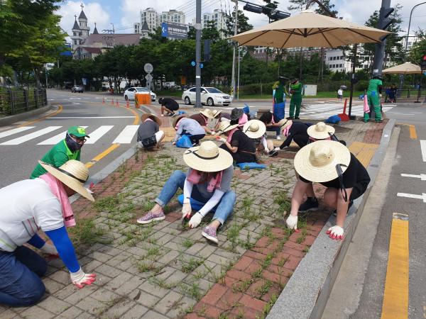 경기 수원시 장안구 정자1동은 최근 동 단체원과 환경관리원, 공무원 등 30여명이 참여한 가운데 여름 휴가철을 맞아 지역내 다중집합장소와 청소 취약지역을 대상으로 대청소를 실시했다. 사진은 참여자들이 인도에 있는 잡초를 제거하는 모습. (사진제공=장안구청)
