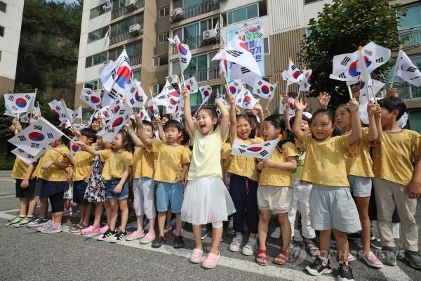 광복절 74주년을 일주일 앞둔 8일 오전 어린이들이 태극기 달기 시범 아파트인 성동구 무악현대아파트에서 태극기를 흔드는 퍼포먼스를 펼치고 있다.