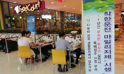 | ▲ 서부서 직원들이 롯데마트에서 착한운전 마일리지제 서약서 접수를 받고 있다. | ||