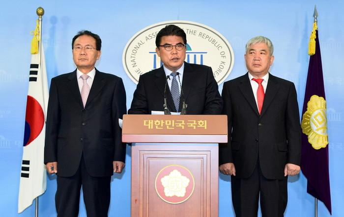 | ▲ 경기 화성갑 보궐선거에 공천신청한 김성회(가운데) 전 의원이 17일 오전 서울 여의도 국회 정론관에서 기자회견을 열고 같은 지역에 출마한 서청원 전 한나라당 대표에게 보내는 공개 질의서를 발표하고 있다. | ||