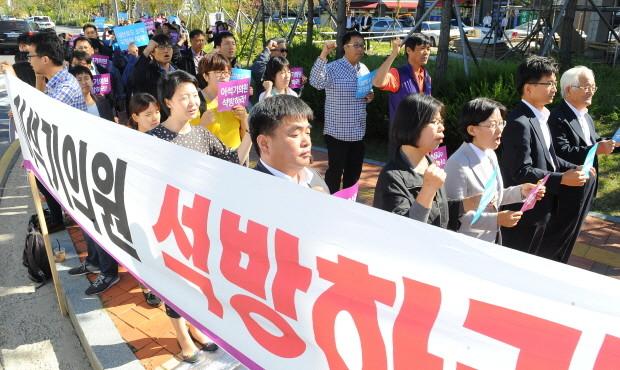 | ▲ 내란음모 사건을 수사 중인 검찰이 통합진보당 이석기 의원을 구속기소하고 중간수사 결과를 발표한 26일 오후 경기 수원지검 앞에서 김미희 통진당 의원과 국정원 내란음모 정치공작 공안탄압 규탄 경기대책위가 이석기 의원 석방을 촉구하며 시위를 벌이고 있다. | ||