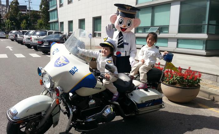 | ▲ 건영유치원’ 원생들이 교통 사이카에 안자 교통경찰 체험 교육을 받으며 환하게 웃고 있다. | ||