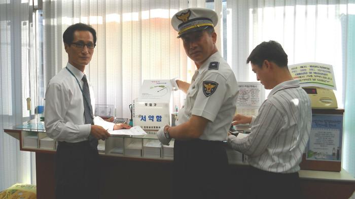 | ▲ 삼산서 직원이 착한운전마일리지제 수거함을 설치한 후 포즈를 취하고 있다. | ||
