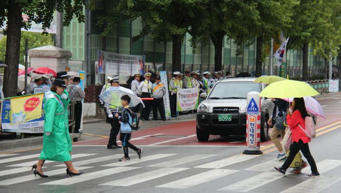 | ▲ 녹색어머니회 등 협력단체 회원들이 어린이 교통안전 캠페인을 전개하고 있다. | ||