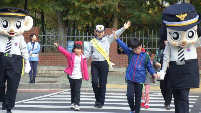 | ▲ 교통안전 캠페인에 참여한 협력단체 회원들이 어린이들을 대상으로 안전한 보행 지도를 하고 있다. | ||