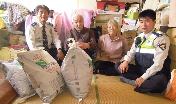 | ▲ 연안파출소 직원들이 독거노인 가정을 방문, 쌀 등을 전달하며 포즈를 취하고 있다. | ||