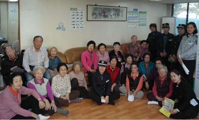 | ▲ 노인정을 방문한 경찰관들과 녹색어머니회원들이 포즈를 취하고 있다. | ||