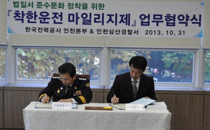 | ▲ 조정필(왼쪽) 삼산서장과 장재원 한전 인천본부장이 착한운전 마일리지제 정착을 위한 서명을 하고 있다. | ||