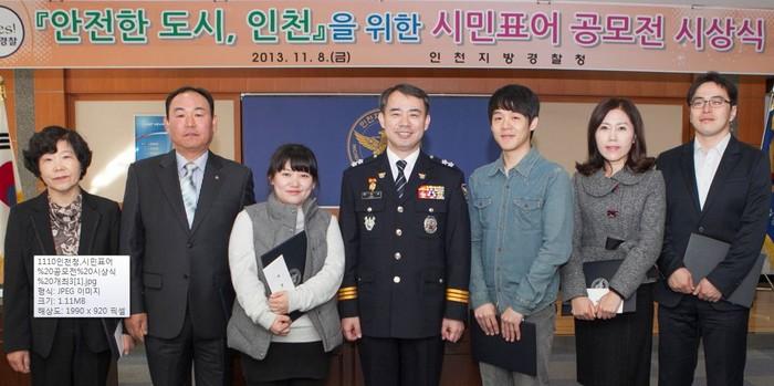 | ▲ 안전한 도시 인천 시민표어 공모전 시상식 참가자들이 기념촬영을 하고 있다. | ||