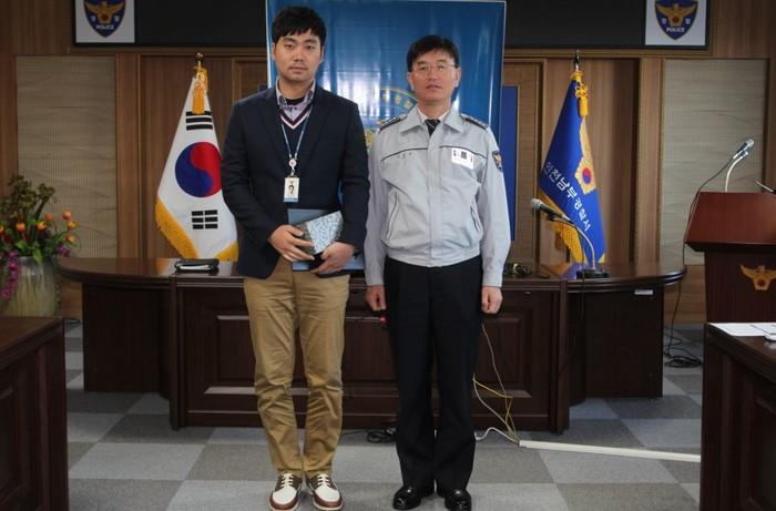 | ▲ 안정균 서장(오른쪽)이 최세원 경장에게 표창장을 수여한 후 함께 기념촬영을 하고 있다. | ||