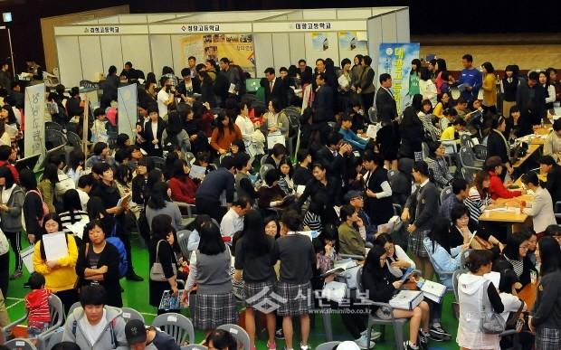 | ▲ 지난해 동대문구가 개최한 고교진학정보박람회에 참여한 학생과 학부모들이 박람회장을 둘러보며 고교진학과 관련된 정보를 수집하고 있다. | ||