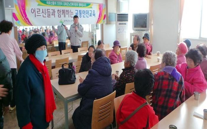 | ▲ 강화서 직원이 노인들을 대상으로 교통안전 교육을 하고 있다. | ||