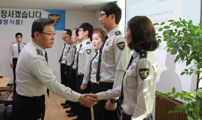 | ▲ 이창수 서장이 신임 순경들과 악수를 나누고 있다. | ||