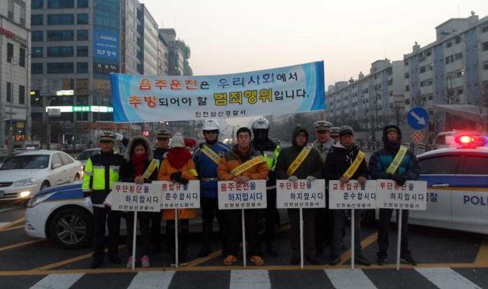 | ▲ 음주운전 추방 교통안전캠페인 참가자들이 피켓 등을 들고 홍보활동을 펼치고 있다. | ||