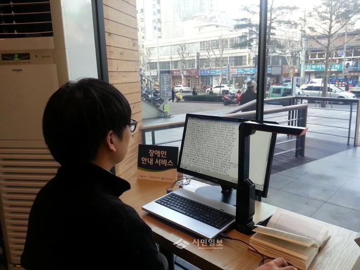 | ▲ 시각장애인을 위해 설치한 독서용 문자인식기를 도서관 직원이 시범사용하고 있다. | ||