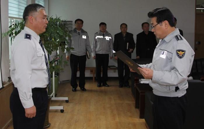 | ▲ 이창수 서장(오른쪽)이 양영석 경위에게 모범공무원증을 수여하고 있다. | ||