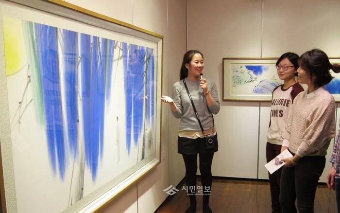 | ▲ 박노수미술관에서 작품 해설자가 전시중인 '달과 소년'의 작품에 대해 설명하고 있다. | ||