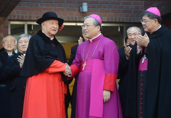 | ▲ 한국 세 번째 추기경에 임명된 서울대교구장 염수정(가운데) 안드레아 대주교가 13일 오전 서울 명동 서울대교구 주교관 앞마당에서 열린 축하식에서 정진석 추기경에게 축하를 받고 있다. 서임식은 다음달 22일 로마 바티칸 교황청에서 열린다. /뉴시스 | ||