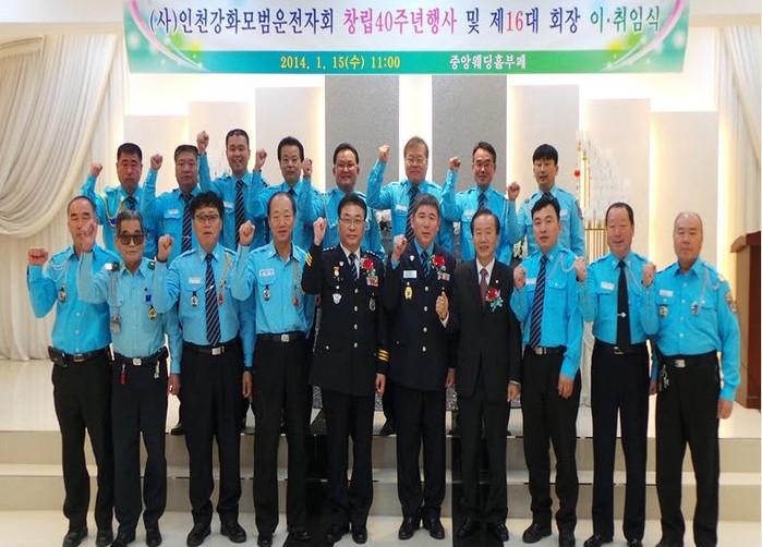 | ▲ 강화경찰서 모범운전자 창립 40주년 기념식 및 14대 회장 이, 취임식 행사 참가자들이 기념촬영을 하고 있다. | ||