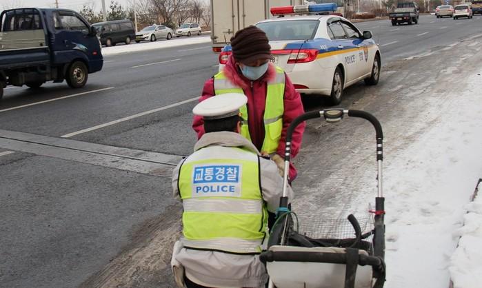 | ▲ 계양서 직원이 파지수집 노인에게 야광조끼를 입혀주고 있다. | ||