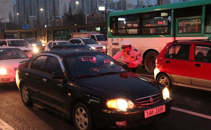| ▲ 계양서 직원이 운전 중 DMB 시청근절 현장 캠페인을 전개하고 있다. | ||