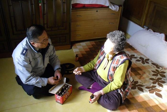 | ▲ 김창우 길상파출소장(왼쪽)이 독거노인 세대를 방문, 대화를 나누고 있다. | ||