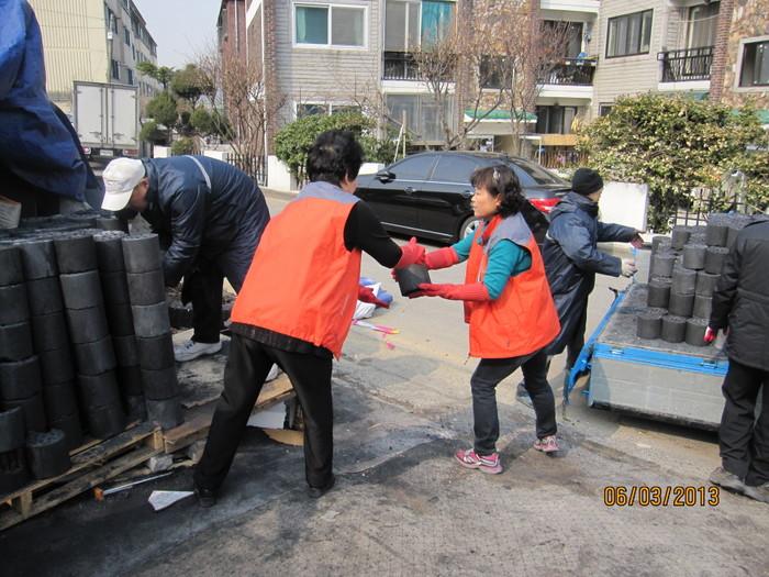 | ▲ 사례관리세대로 지정된 가구에 후원물품인 연탄을 전달하기 위해 연탄을 나르는 통통희망나래단의 모습. | ||