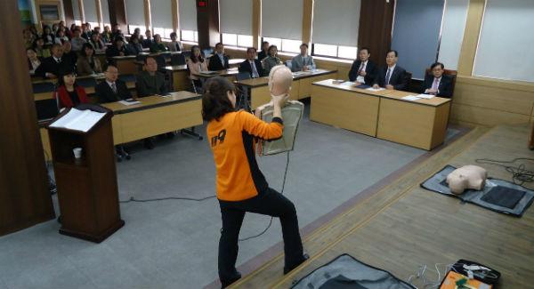 이날 교육은 심폐소생술 가이드라인에 따라 ‘가족과 동료의 생명을 내손으로 구한다’라는 자신감을 배양하고 심장마비, 뇌졸중과 같은 응급상황이 발생할 경우 적절히 대처할 수 있도록 CPR마네킹을 이용한 체험교육 위주로 진행됐다.