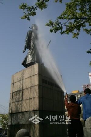 | ▲ 먼지 등이 묻은 시설물에 물청소를 실시하고 있는 모습. (사진제공=마포구청) | ||