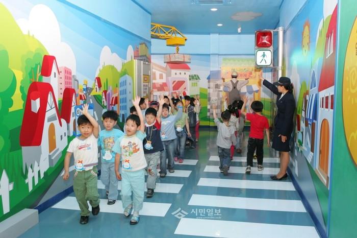 | ▲ 어린이들이 교통사고를 예방하고 교통안전과 관련된 내용을 이론뿐 아니라 유사한 환경에서 직접 체험해볼 수 있는 양천구 신정7동의 어린이교통공원에서 어린이들이 전문강사와 함께 횡단보도를 안전하게 건너는 방법을 연습하는 모습. (사진제공=양천구청) | ||
