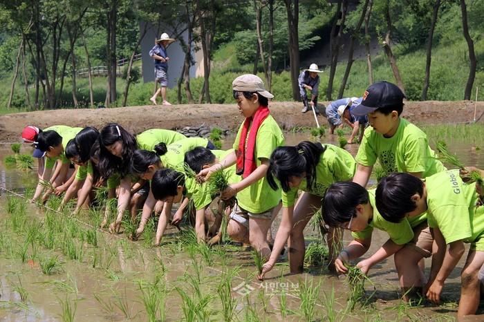 | ▲ 지난해 양재천 벼농사 학습장을 방문해 농촌문화체험에 동참한 지역내 초등학생들이 전통 모내기방식으로 모를 하나하나씩 땅에 심고있는 모습. | ||
