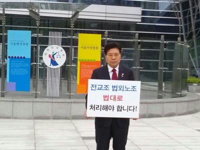 | ▲ 새누리당 홍문종 의원이 19일 서울행정법원 입구에서 전교조 법외노조 통보 취소소송 1심 판결을 앞두고 1인 시위를 하고 있는 모습. | ||
