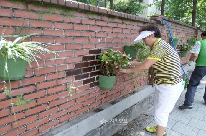 | ▲ 최근 주민들이 서울가든아파트 담장 화분에 꽃을 심고 물을 주고 있는 모습. (사진제공=도봉구청) | ||