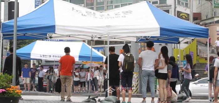 | ▲ 9호선 노량진역 앞 횡단보도에 설치된 그늘막에서 주민들이 신호를 기다리고 있다. (사진제공=동작구청) | ||